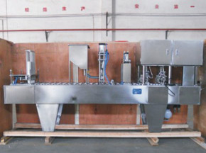 本机可用于饮料、八宝粥、鲜奶等产品的单片铝箔或纸片的封口包装。包装产品美观档次。本机从送杯、充填、液位控制、放盖、两次封口、推杯、输送为全自动作业。本机为一机多用型高速全自动充填封口机。