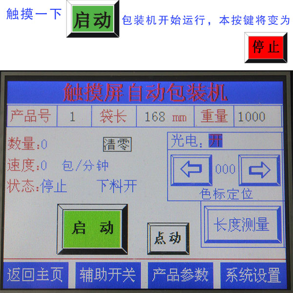 5.全自动化冰糖包装机械自动包装可进行启动/停止、点动、光电开关、色标定位、数量清零和链接其它页面的操作