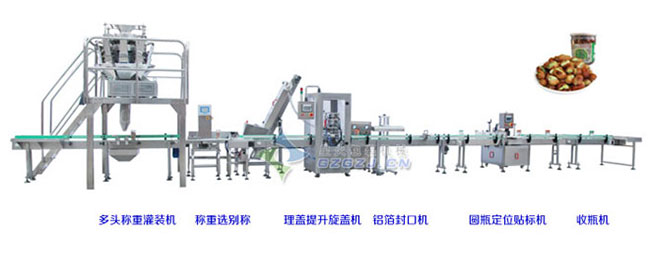 颗粒称重灌装旋盖贴标生产线适用于瓶装瓜子、开心果、中药饮品花生、五谷杂粮、干果、大米、种子、活性碳、金刚石、杂粮等颗粒粉状物料的定量称重包装。